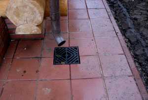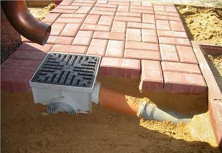 Если крыша дома снабжена водосточной системой, то под каждый вертикальный трубный водоотвод необходимо установить бетонный отлив. Это готовая канавка, которую устанавливают в процессе монтажа тротуарной плитки. Способ установки точно такой же: на сухую смесь под наклоном.