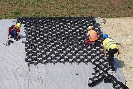 - георешетка – трехмерная конструкция, изготавливаемая, как правило, из полимерных перфорированных лент. В соты решетки засыпают мелкий заполнитель или даже грунт, а трамбовку можно осуществлять, лишь поливая водой. В итоге, грунт надежно закрепляется и не двигается ни в каком направлении;