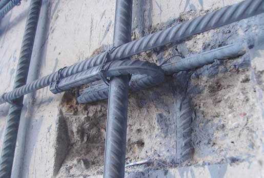 Арматурные сетки обойм и рубашек, установленных с обеих сторон стены,рекомендуется объединить в пространственный каркас с помощью поперечных связевых стержней, размещаемых в просверленных для этой цели в кладке отверстиях. Отверстия с поперечными в них стержнями должны тщательно зачеканиваться раствором или бетоном с заполнителем из мелких фракций.