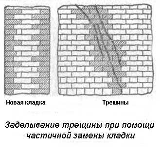 При наличии на стенах трещин с шириной до 4мм, их можно восстанавливать при помощи нагнетания цементного раствора. При значительных глубоких и сквозных трещинах с раскрытием от 4мм в зоне повреждения производится перекладка этого участка. При этом применяется раствор марки 25 при перевязке со старой неповрежденной кладкой.