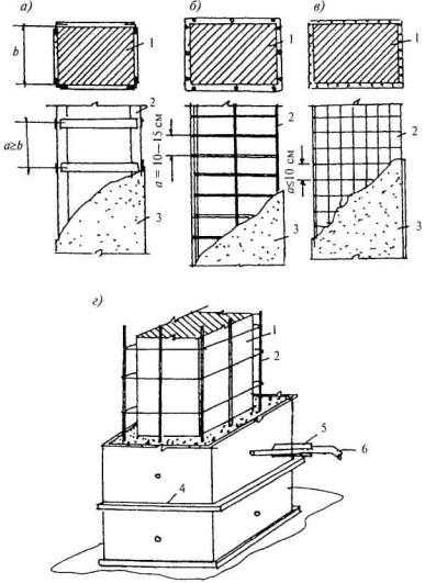 Рис. 6.41. Усиление столбов стальной обоймой (а), армокаркасами (б), сетками и железобетонными обоймами (в, г) 1 — усиливаемая конструкция; 2 — элементы усиления; 3 — защитный слой; 4 — щитовая опалубка с хомутами; 5 — инъектор; 6 — материальный шланг