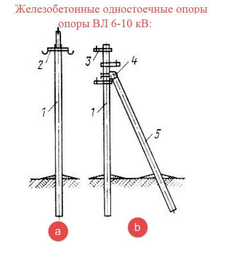 а-Промежуточная опора; b- анкерна опора с подкосом, ставят на углах поворота ЛЭП от 20 до 90 градусов. 10Опора, 5-подкос (подопора)