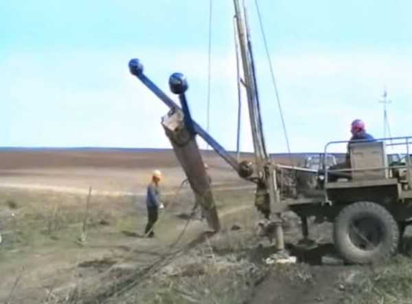- Нижний трос крепится к лебедке трактора. Кран стоит у котлована и им опора поднимается над землей. При этом лебедкой трактора удерживается низ опоры. В таком «подвешенном виде» опору опускают в котлован;