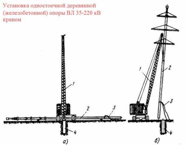 Установка железобетонных опор производится, как правило, стреловыми кранами и кранами-установщиками опор типа КВЛ. При необходимости подтягивания стоек используется трактор. Диаметр цилиндрического пробуренного котлована не должен превышать диаметра стойки более чем на 25 %. При большей разнице устанавливается верхний ригель. Ригели на промежуточных опорах располагаются вдоль оси ВЛ.