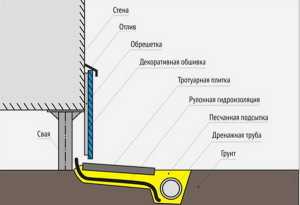 Полоса укладывается с наклоном в 2 – 3% от фундамента, что бы обеспечивался сток воды от дома. Часто по краю утепления в грунте укладывается и дренаж, который отводит воду от фундамента.
