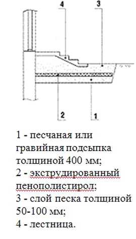 На дно котлована укладывается песчаная подсыпка, которой и формируется сток воды в нужную сторону (обычно от центра конструкции). Листы утеплителя укладываются на подсыпку, накрываются гидроизоляционным материалом, сверху делается песчано-гравийная подсыпка толщиной от 300 мм, которой формируется подушка для перераспределения точечных давлений. Иногда с этой целью закладываются готовые ж/б блоки, или делается заливка легкого фундамента.