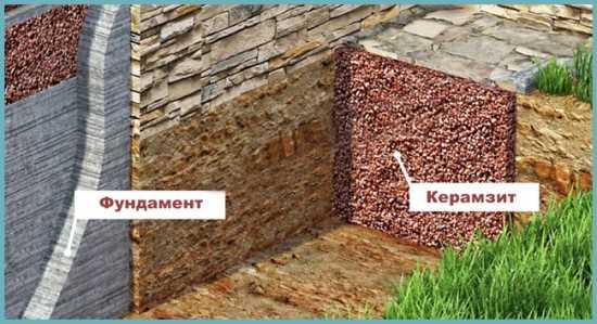 Одним из самых дешевых по материалу, но в то же время и едва ли не самым трудоемким можно считать утепление с использованием керамзита. Помимо того, что вокруг фундамента придется рыть ров шириной не менее полуметра и глубиной до 1 метра, потребуется и перелопатить довольно большое количество этого материала.