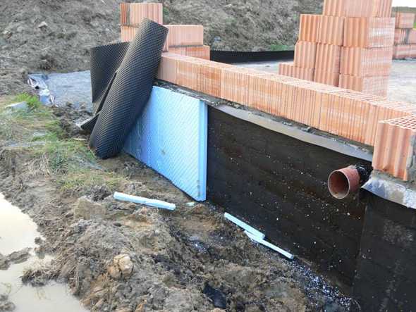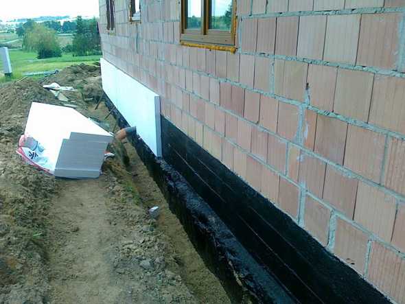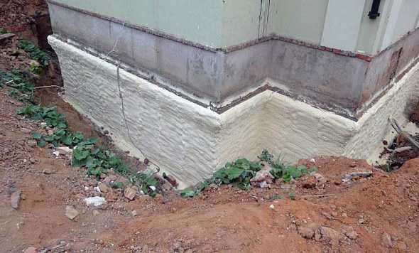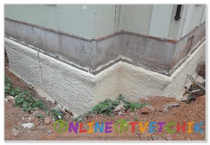 Как и предыдущих двух вариантах, нужно откапывать траншею. Чтобы сэкономить свое время можно нанять спецтехнику. Дно траншеи полностью очищают от корней растений, а стену фундамента от грязи, и просушивают. Обязательно цоколь покрывают 2 слоями битумной мастики.