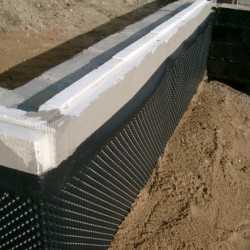 Траншею засыпать рекомендуется сухим гравием или крупным песком, чтобы создать дополнительный тепловой контур. Выступающую над землей часть оклеенного пенопластом фундамента рекомендуется в противопожарных целях оштукатурить. Для этого пенополистирол нужно будет оклеить ячеистой штукатурной лентой, а после листы заштукатуриваются.