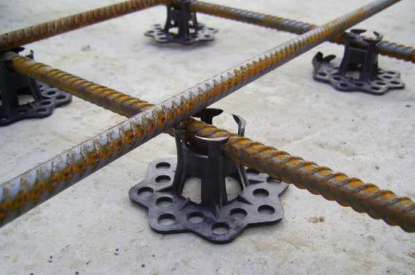 Фиксаторы нужны для создания зазора между опалубкой и краем арматуры. Благодаря им каркас будет скрыт в толще плиты после окончательного застывания бетона, а это предотвратит его быструю коррозию и скорое разрушение возведённого фундамента.