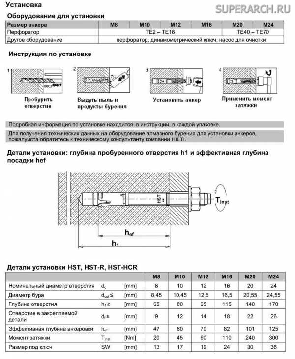 Устанавливают анкер-шпильку HILTI с помощью специального инструмента HS-SC, такой прибор используется для болтов анкерного вида HST и HSA, которые имеют резьбу от 6 до 12. Такой инструмент используется при необходимости быстрого сооружения различных крупных конструкций, так как экономиться время на установку. Инструмент механического вида HS-SC предназначается для быстрой установки анкеров вида HST и HSA, при этом работы выполняются с высокой точностью.