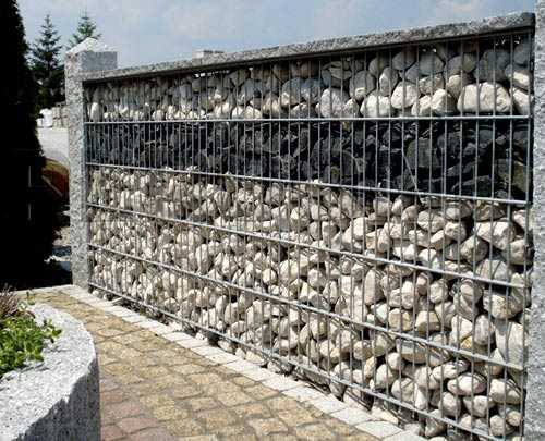 Похожие конструкции строили в древности для укрепления военных сооружений, чтобы подчеркнуть неприступность объекта. И сегодня они вызывают такие же ассоциации, контрастируя с зелеными насаждениями и яркими цветами сада.Прежде чем строить каменное ограждение, необходимо подобрать цвет этой природной начинки. А еще следует знать, что эстетически проигрывают как очень крупные, так и чрезмерно мелкие камешки. Наиболее подходящим является средний размер.
