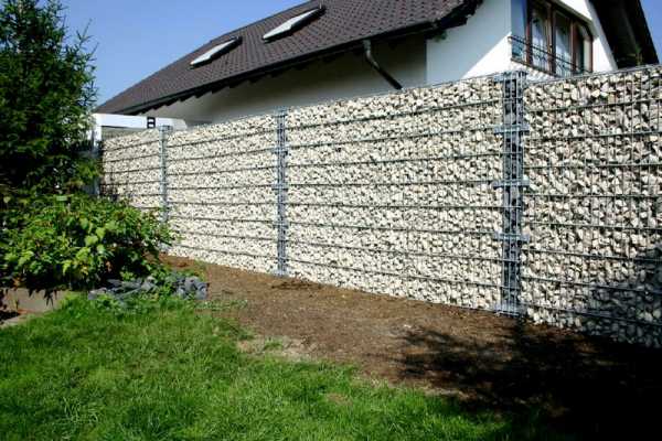 Ширина ямы — 20 х 20 см. Столб устанавливается в яму по уровню строго вертикально и фиксируется распорками из дерева. В яму заливается раствор, хорошо утрамбовывается и оставляется до высыхания. - Монтаж сетки. После установки стоек должно пройти как минимум три дня, чтобы бетон хорошо схватился. Сетчатый каркас к столбам можно крепить с помощью болтов, шайб, гаек. Сетки между собой фиксируются стяжными скобами. Сетку нужно выбирать соответственно наполнению: камень не должен выпадать из ячеек, образуя пустоты.
