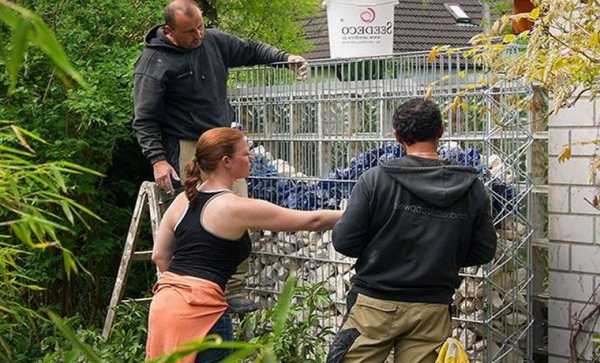 - Укладка камня. Самый интересный и творческий этап, который осуществляется вручную. Камни или любой другой наполнитель укладывается в сетке хаотично или с орнаментом. Хороший вариант — уложить слой земли между рядами камней и посадить растения, которые в скором времени образуют живую изгородь и будут прекрасно гармонировать — с каменной.
