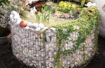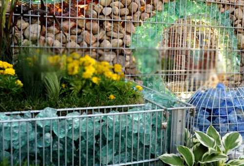 Заполнитель корзин подбирается по вкусу. Им может быть любой материал, все, что подскажет фантазия. При этом не потребуются большие финансовые затраты. А если металлические конструкции очень красивы, то сетки можно оставить незаполненными. Это зависит от хозяина. Здесь для него широкое поле для творчества.