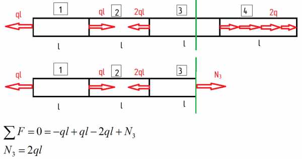 Перемещение верхнего сечения (3) сложится из смещения сечения (2) и абсолютной деформации Iго участка: