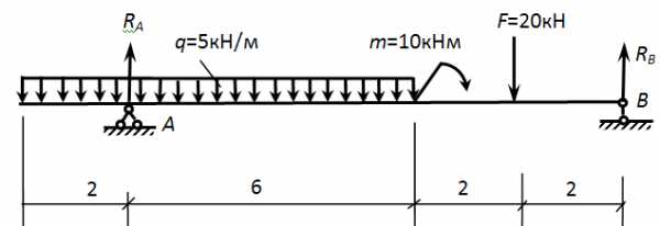 Для балки определить опорные реакции и построить эпюры изгибающих моментов (М) и поперечных сил (Q).