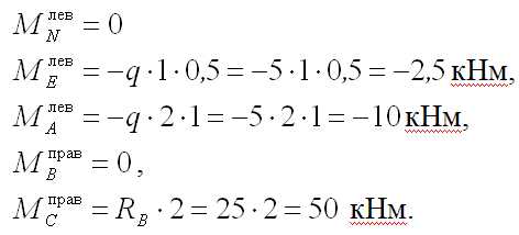 Итак, точки расставлены, приступаем к определению в них значений изгибающих моментов. Правило знаков — см. здесь.