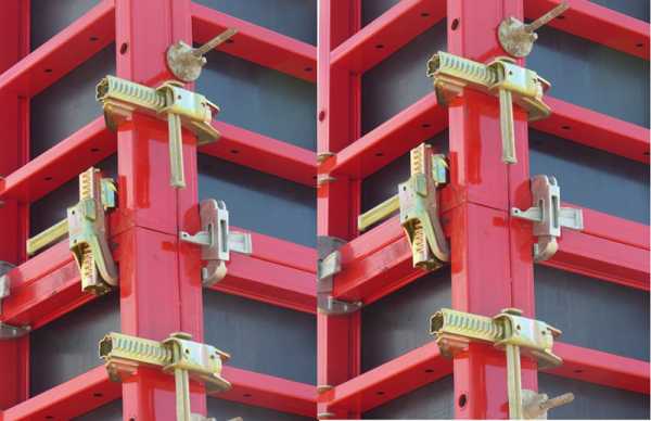 Для установки и выверки монолитной опалубки в вертикальном положении используются специальные подкосы. Но кроме этого, опалубочные щиты необходимо надежно соединить между собой торцевыми поверхностями, чтобы палубы соседних щитов составили единую плоскость, ограничивающую жидкий строительный раствор в строго оговоренных проектом объемах и формах.