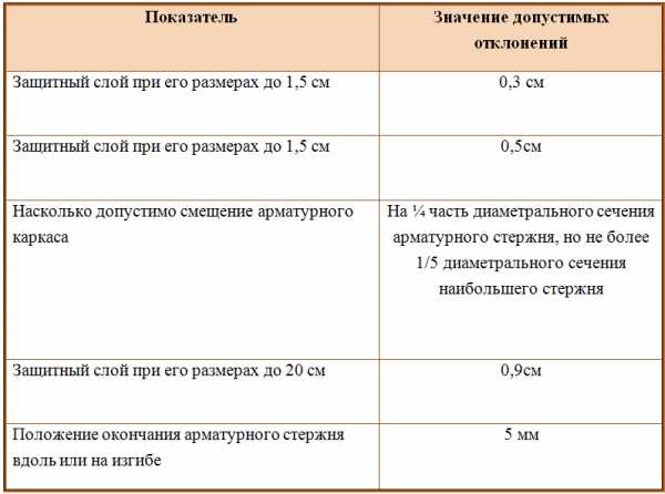 Отклонения от толщины защитного слоя по проекту не должны превышать 4-8 мм в сторону увеличения защитного слоя и 3-5 мм в сторону его уменьшения в зависимости от диаметра арматуры и сечения бетонной конструкции [пункт 2.104 СНиП 3.03.01-87].