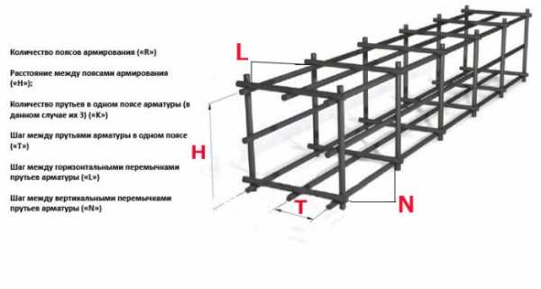 Расположение арматуры с разной нагрузкой в типовом каркасе ленточного фундамента