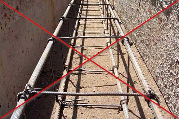Абсолютно безграмотное расположение арматурного каркаса – нижний ярус арматуры вообще не получает никакого защитного слоя, так как лежит на дне траншеи