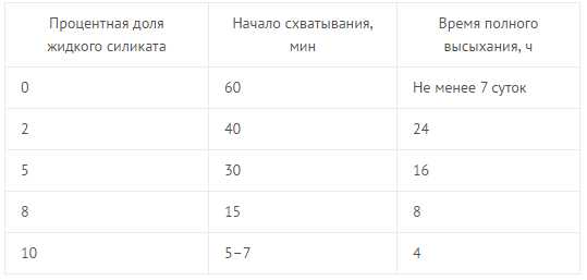 - При увеличении процентной доли силиката до 10%, продолжительность высыхания уменьшается до 4 часов с соответствующим сокращением начала схватывания до 5 минут.